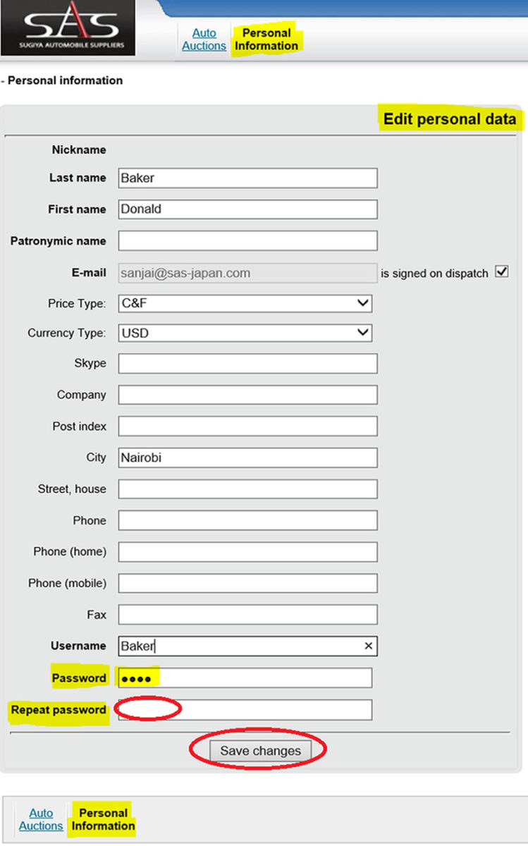 You can change your password and other personal information. After you sign into the Auction Site, click on Personal Information and input the changes you want to make. When finished, type in your password or new password TWICE and then press Save Changes.