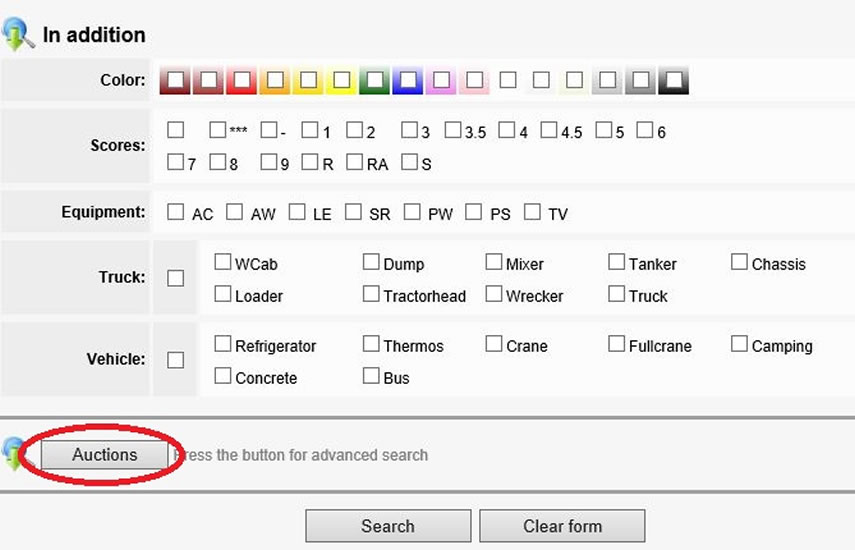 B. You can also select additional information such as Color, Auction Grade, etc. If you want to search for your car at a specific auction, press on the “Auctions” button in the middle of the screen to open a list of all the auctions in Japan.