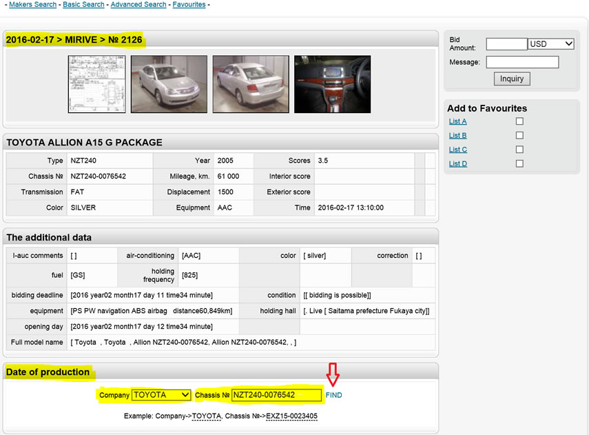 To find out the manufacture date of the car, scroll down to Date of Production and select the manufacturer. Then enter the chassis # and click on FIND.