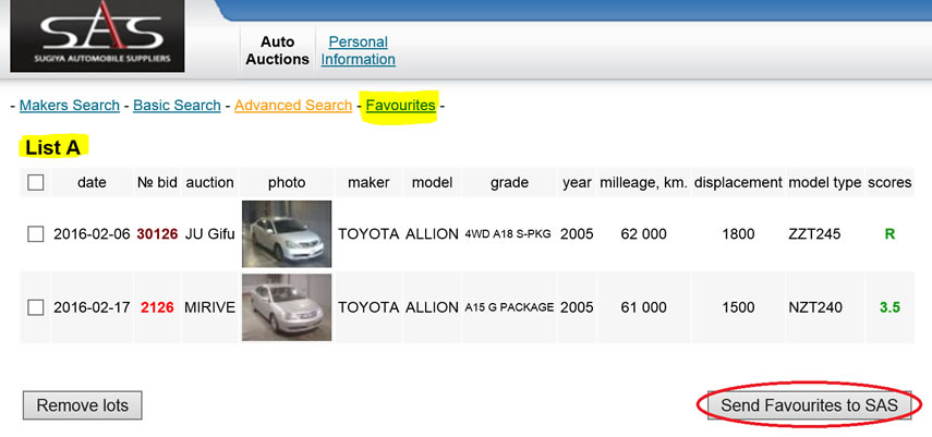You can send the list of the vehicles in your favorites to SAS with one click. Open the Favourites List (e.g., List A) and press the Send Favourites to SAS button.
