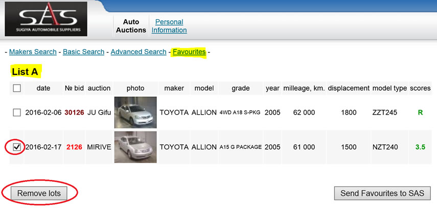 To remove vehicles from your list of favorites, open the Favourites List (e.g., List A) and check the box on the very left of the car you want to delete. Then click on the Remove Lots button. You can delete multiple cars at one time by checking more than one box.