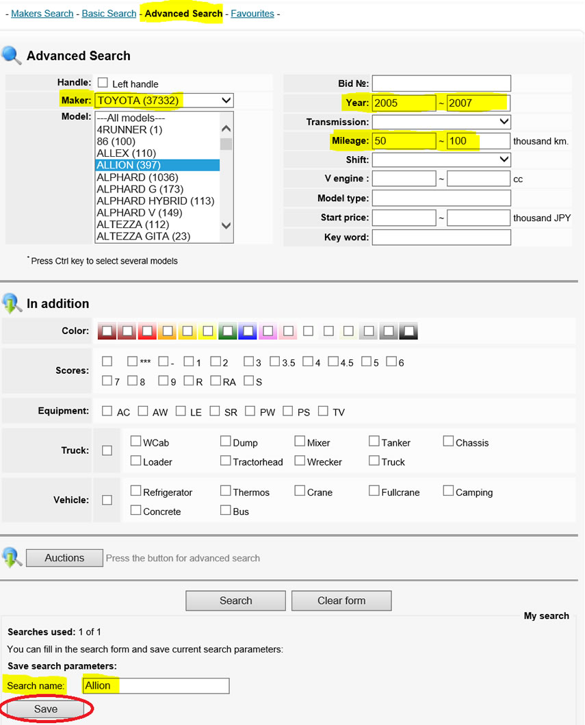 If you know that you are going to search for the same vehicle many times, you can save time by saving the search criteria in the My Search box at the bottom of the Advanced Search page. Fill in your search criteria as per the instructions in section 3 above. Then enter a name for your search criteria, for example “Allion”. Then press the Save button. Next time you want to search for the same car, you just select the saved search criteria and press “Search”. You don’t need to enter all the information again.
