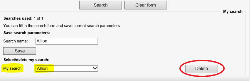 To delete the search criteria you saved, go to the the My Search box, select the search name and then click on Delete. You can then save a new search criteria by following the directions in #8 above.