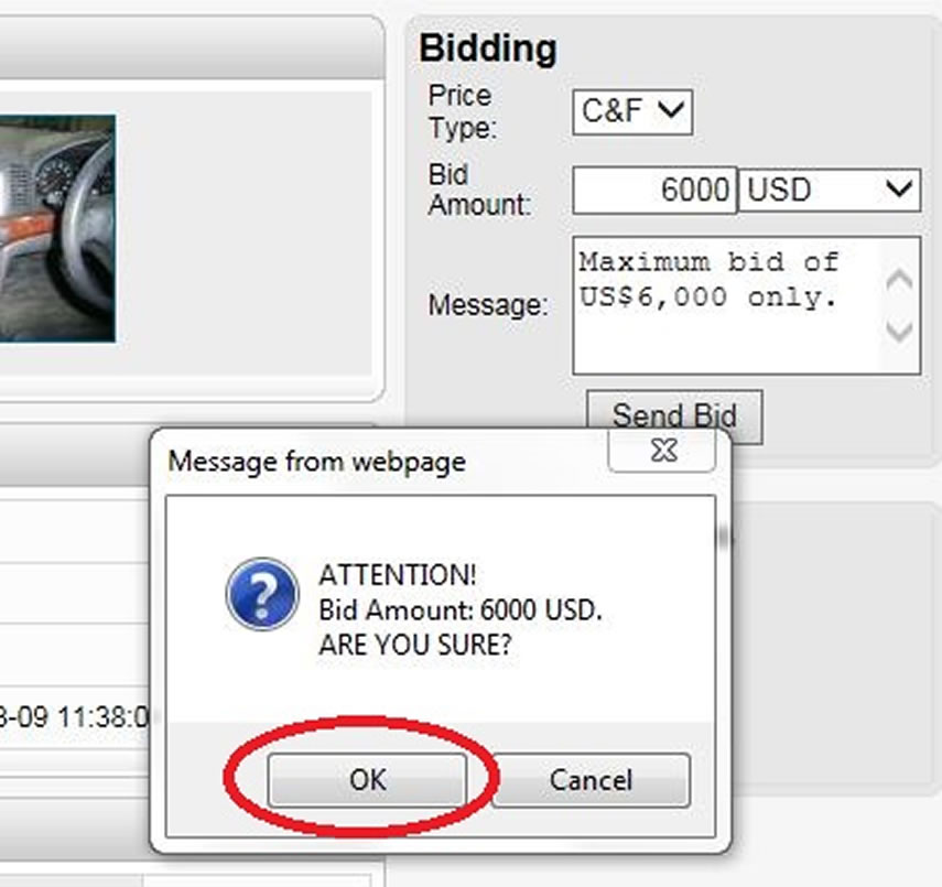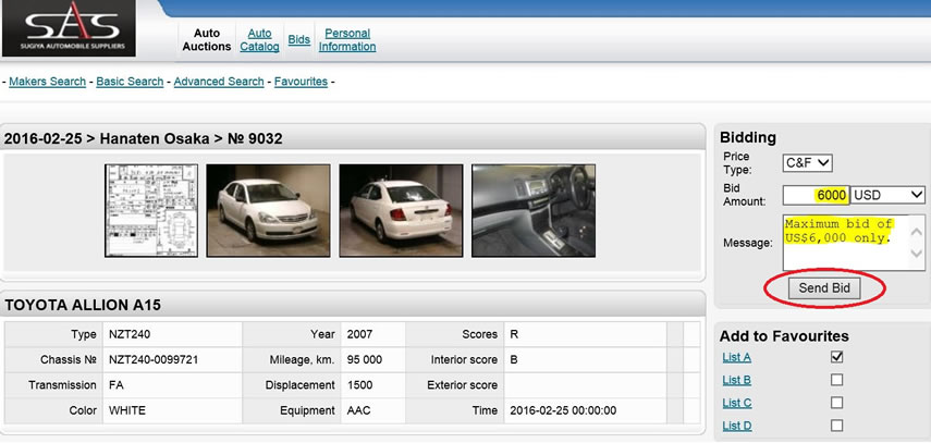 A. When you have found the vehicle that you want to purchase, you can place a bid by inputting the maximum C&F US$ value that you are willing to go up to. If you have any comments or questions, you can input it in the Message box. When you are ready to place the bid, press the Send Bid button.
