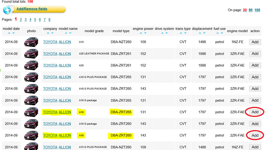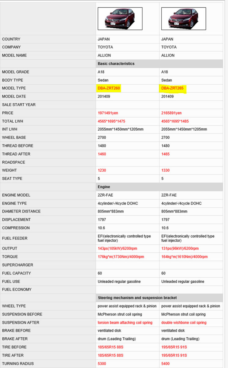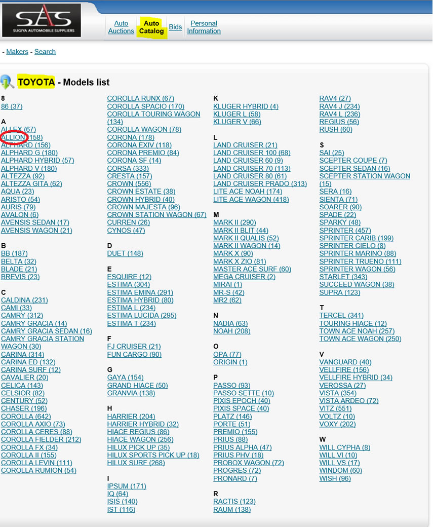For example, if you wanted to compare the specifications of a Toyota Allion grade A18 model #ZRT265 with model #ZRT260, you would first click on “Toyota”.